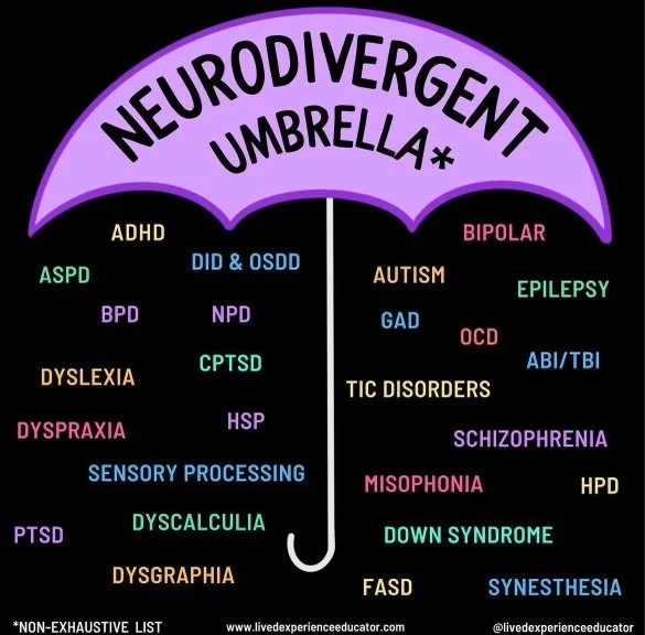 The term was first coined by Kassiane Asasumasu, a neurodivergent (ND) activist, in 2000. The definition of neurodivergent from the oxford dictionary is “differing in mental or neurological function from what is considered typical or “normal (neuronormative)” Neurodivergent is an umbrella term the encapsulates a variety of neurotypes – see this great visual from @livedexperienceducator below.